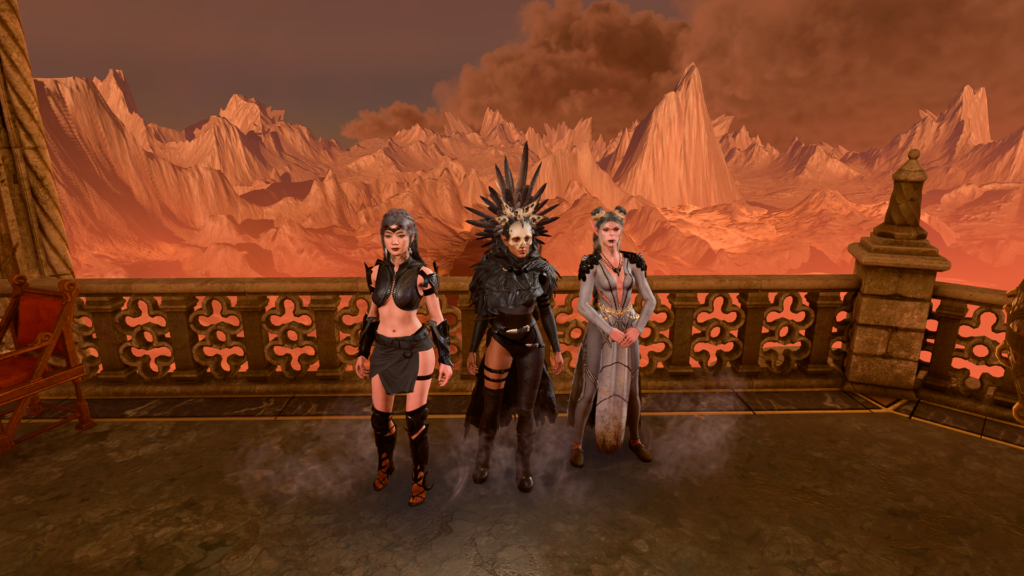Praxidike, Ereshkigal, and Hel. My badass queens of the underworld (Greek, Sumerian, and Norse, respectively). Here all wearing fancy clothes/modded outfits.