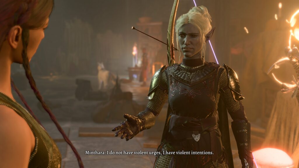 Another side effect I should have seen coming was that I would not do well with the more self-absorbed and pragmatic companions: Minthara and Astarion. For my Dark Urge playthrough, they were my ride or dies, because they were very much on board with seizing power. In Light Urge, I gave up power whenever possible, tried to save everyone, and chose the ‘goody-goody’ options. Predictably, it was like whack-a-mole in the upper left corner with their “disapprove” judgments. However, Minthara is a little easier to gain back some approval points by choosing dialogue options supporting her vengeance against those that wronged her (which Real Angela is very much for). Astarion has fewer direct dialogue options that way, and I also flubbed a fight that would have gotten me approval earlier in the game.