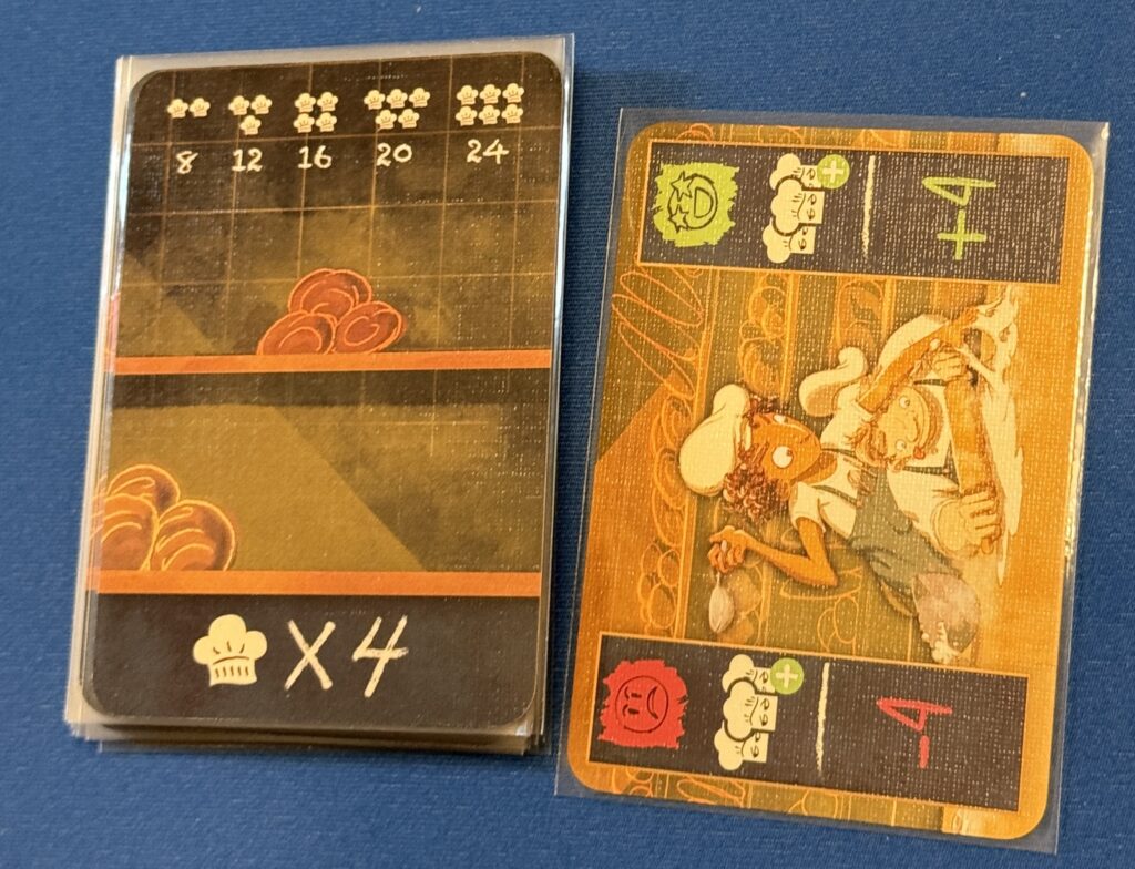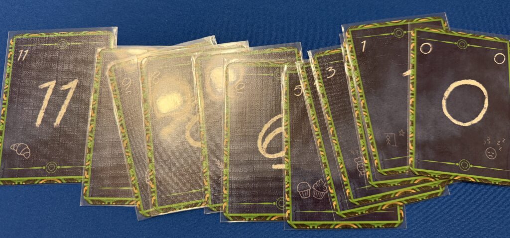 In Leaf, you’re playing the role of the wind blowing leaves around. I got this tidbit from the web site; we didn’t focus on our role any more than a Splendor player recognizes that they’re a jeweler for nobility.The central play area near the start of the game. Players take turns placing leaves from the green board near the center of this picture, playing cards to choose which leaf to place. There are several ways to score in the game. One of them is by moving your squirrel meeple (squirple?) up the tree on the left. Another is to provide safe hibernation for the animals whose cards you see on the right.The central play area as we headed towards the end of the game. Notice that the season marker on the far right has advanced as we head towards winter (Winter is coming!). Yet another way to score is to collect sun tokens (you can see those in the previous image) and use them to advance the season token, collecting the acorns (victory points) shown on the track.My play area at the same point in the game. I’ve managed to provide safe hibernation for a couple of owls. So far I’ve managed to collect seven points. In the upper right you can see my mushroom tokens, which are yet another way to gain points.The leaves we’ve placed at the same point in the game as the previous two photos. When you place a leaf, you can perform actions associated with the colors of the other leaves that your own leaf touches. For example, the player who put the green poplar leaf in the upper center (the one with the yellow mushroom token on it) was able to perform two red actions and two orange actions, because those were the colors of the points that touched the leaf they’d just placed. Mushrooms are scored by forming chains of fully-grown mushrooms in adjacent leaves.The leaf arrangement at the end of the game. You can see that the leaves take up so much table space that we had to place them on top of A’s animal cards. J’s tokens are red; it’s hard to tell because of the glare, but J has one “chain” of three adult mushrooms towards the right and another pair of adjacent mushrooms on the left.My play area at the end of the game. I was able to provide a home for a few more woodland creatures, but not as many as I’d’ve liked. In the upper right you can see that the sun token has reached the end of the track, which is one of the end-game triggers; the other is when three piles of leaves are exhausted. As it happens, we got both conditions in the same round.At the end of the game I had 35 acorns/points……which was good enough to come in second to J, with 43 points. Congratulations!We moved on to a couple of games of L’Oaf. We’re bakers in the L’Oaf bakery.We’re trying to get bread-baking tasks done, by spending the least amount of effort possible. In other words, we’re both loafing around and loafing around. We try to avoid the wrath of the red baker while impressing the the green baker.Every player starts with twelve cards, numbered 0 to 11. You play a card every round. You don’t necessarily play to succeed in each task; there’s an aspect of “double-think” where failure can drive the others players’ scores into the negative. But play too low a card, and it’s your own score that’s decreased.An example of a typical task. The card on the left says that, for a four-player game, the total points on the sum of the cards played must be reach at least 16; the card helpfully points out that’s an average of 4 points per player. The card on the right shows what happens after cards are played; in this particular case, if the baking order succeeds all the players in the green section of the scoring track get four points; if the job fails, all the players in the green section of the track lose four points. It looks like someone stuck in the red section has little incentive to cooperate!The game ends when there are five tasks that have succeeded or five tasks that have failed. If it ends with your token on the red side of the track, you automatically lose. M (yellow) played cleverly; she was the only one on the positive track, so she automatically won and any other end-game scoring didn’t matter.The end of the second game was a bit more complex. M was in the negative, and so automatically lost. While it looks like green (me) and J (red) are tied, we’re not. At the end of the game, you add the total points on the cards left in your hand to the number in the medal on the left side of that green track. If you add it all up, you’ll see that A and I tied, and shared the victory.