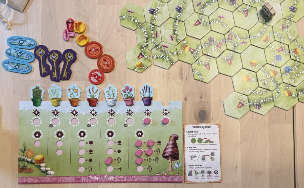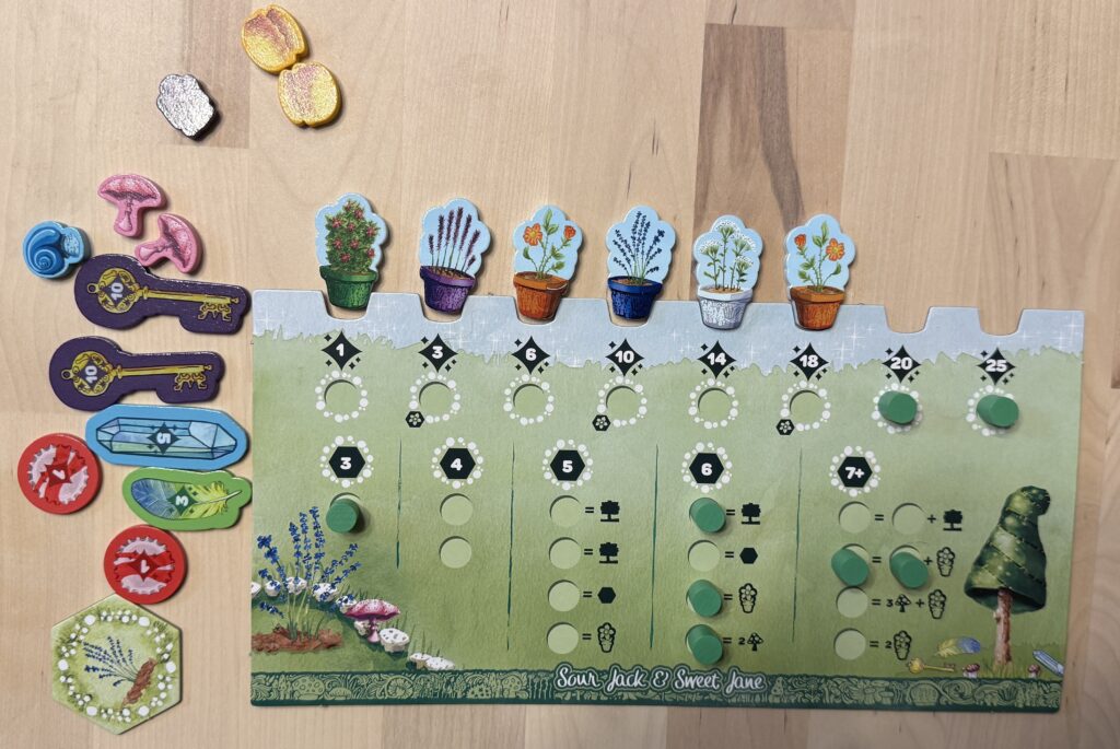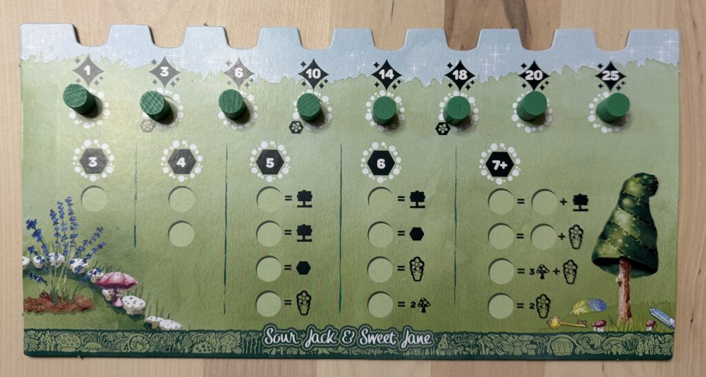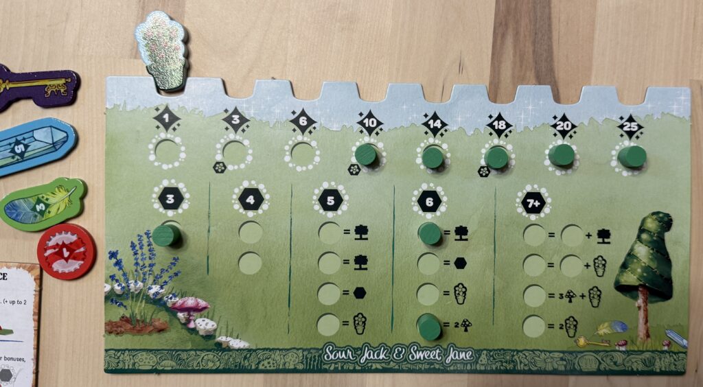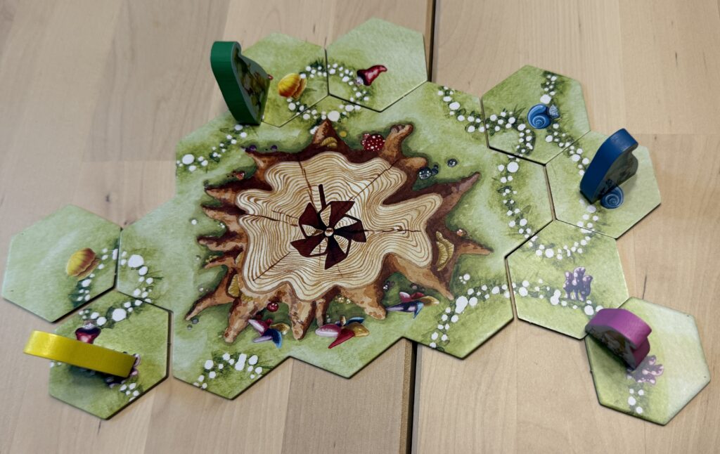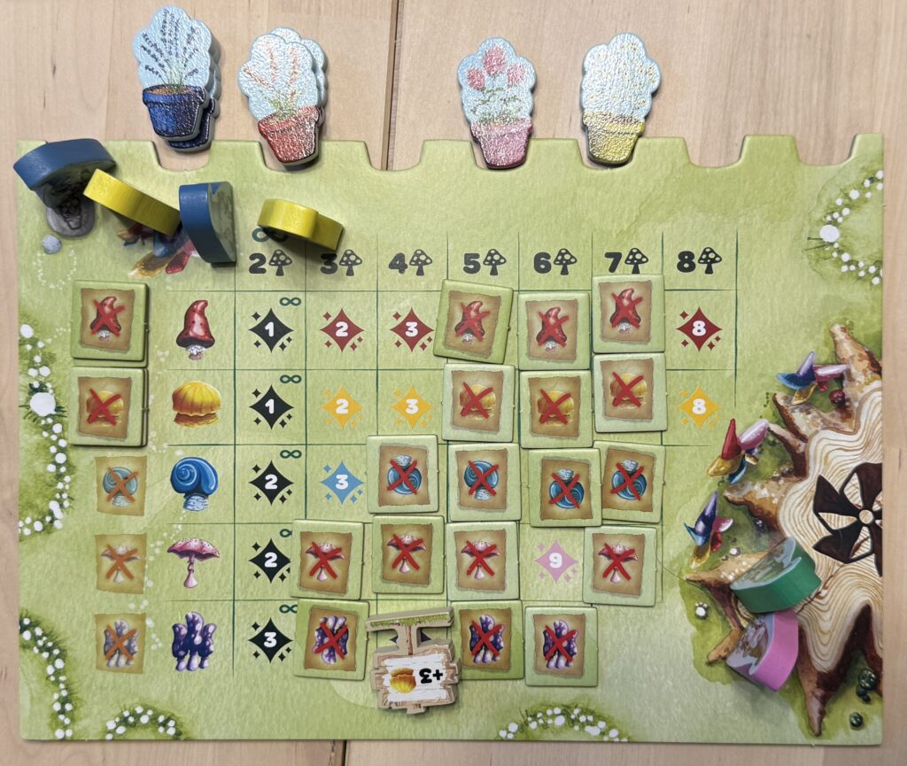 My player board mid-game. So far I’ve built three mushroom circles, one with three tiles and two with six tiles. I’ve also gained a flower pot. As with the circle-completion cylinders, the number of flower pots you gain adds to your end-game score.