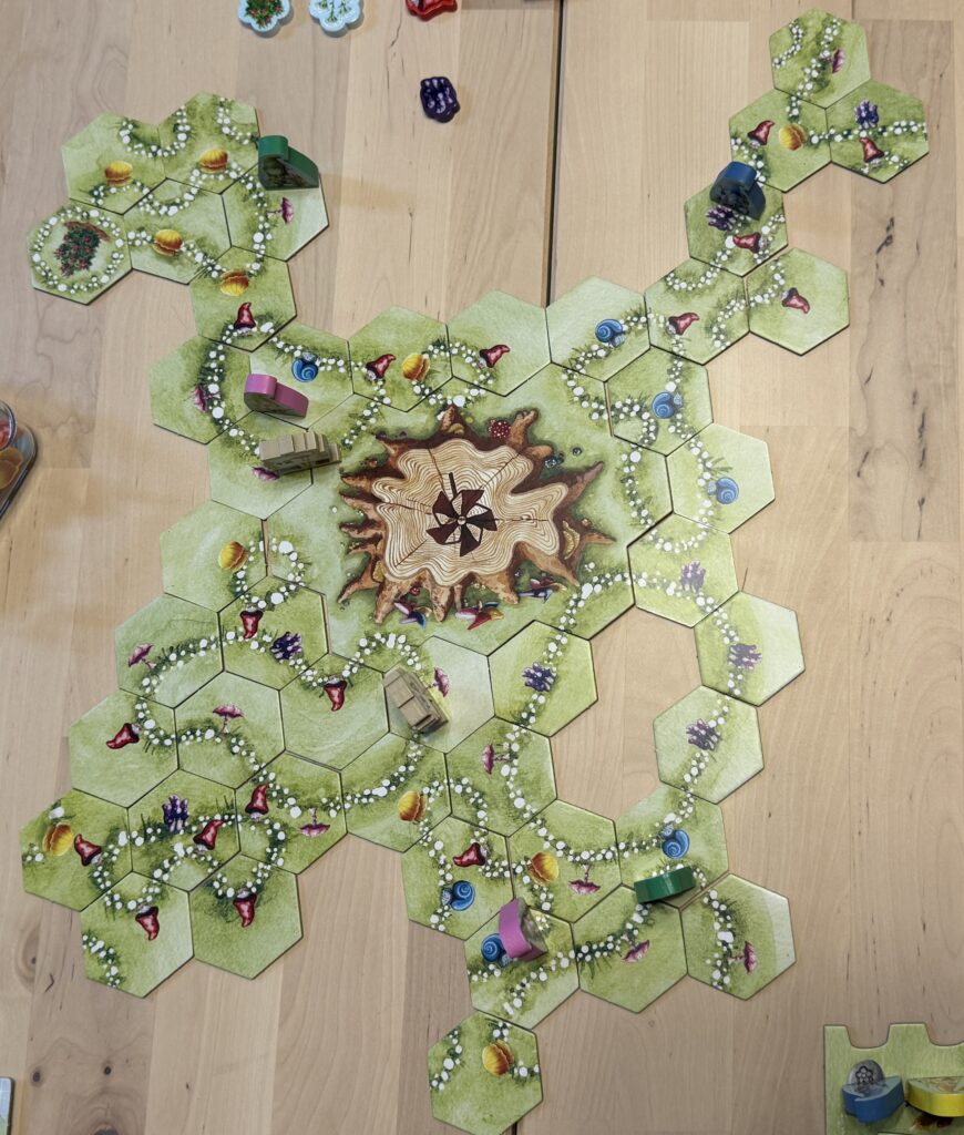 Our hollow grows larger. Once a circle is completed, there’s little reason for anyone to return to it. Those beige pieces (you can see one in the 10 o’clock position next to the stump) are signposts. A player can choose, as part of their circle-completion reward for the larger circles, to place a signpost on a circle; anyone returning to that circle gets the benefit of that signpost. This is not entirely altruistic; the player placing the sign gets the sign’s benefits immediately. Subsequent players have to spend a turn to move a gnome onto that circle.
