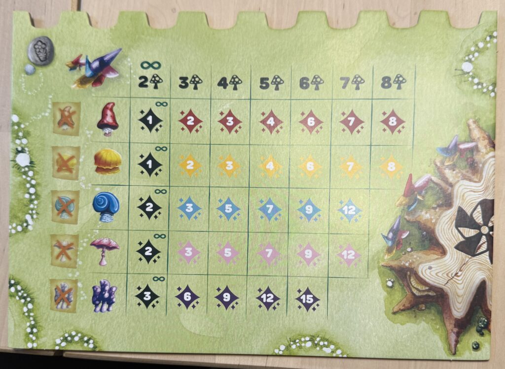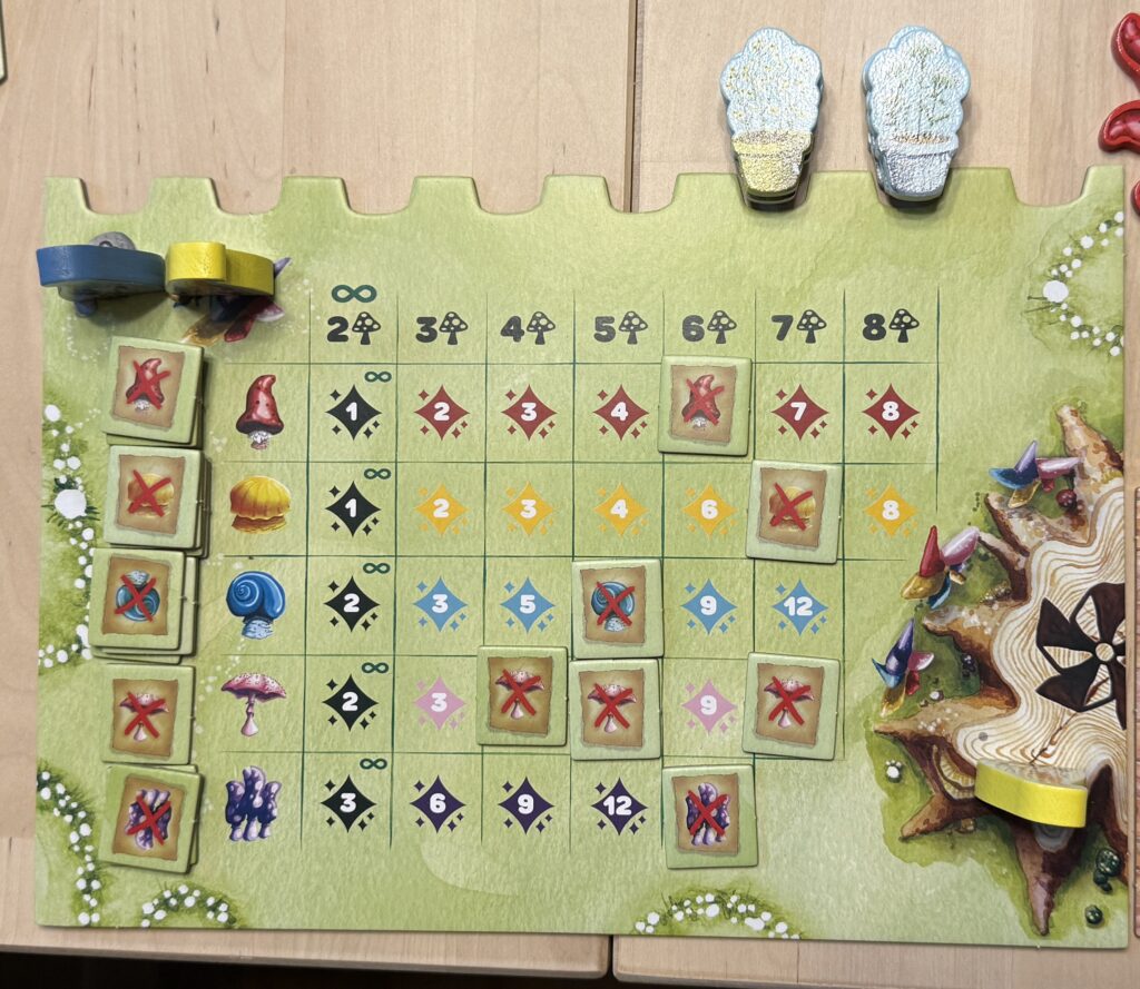 The mushroom market as we continued to play. Once you’ve sold a given number of mushrooms of a given color, that space on the market is locked out; no one can make that particular sale for the rest of the game. There’s also a limit to the number of sales of a particular color of mushroom; note that there can be only one more sale of pink mushrooms for the rest of the game. (That’s not quite true; the black diamonds for sales of two mushrooms can be used repeatedly. But they yield so few points it’s not worth it.)