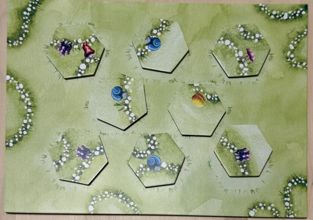 The available tiles come from this board. You’re trying to position the mushroom paths to complete connected curves and gain points. Among other benefits, when you do this you get the mushrooms shown on the paths.