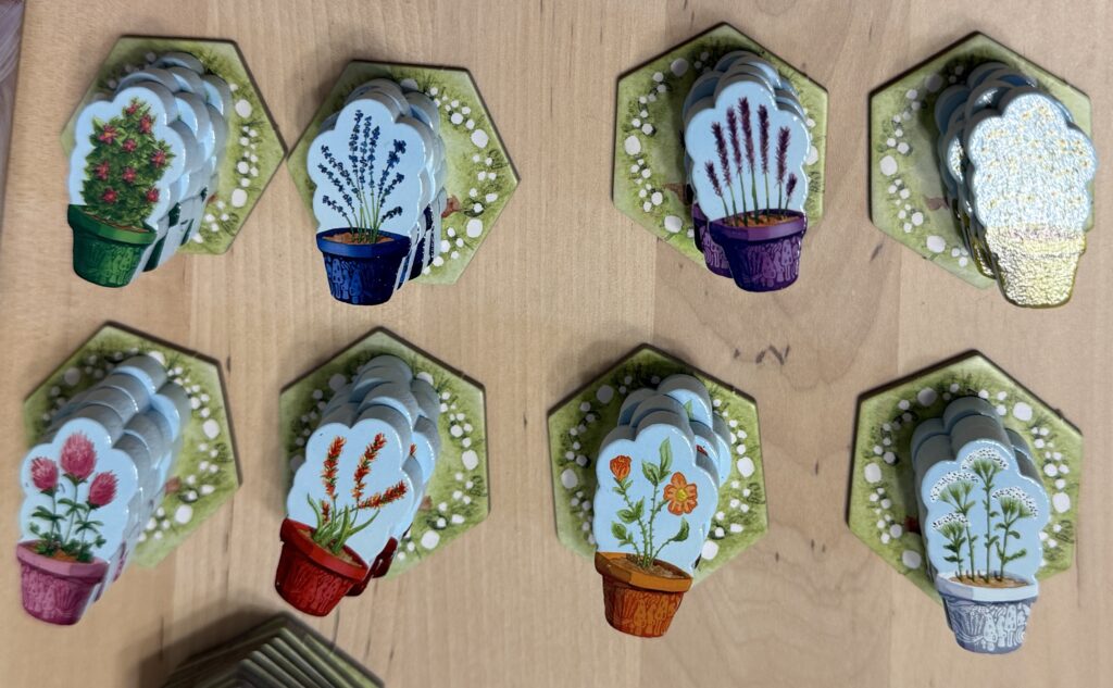 Another way to gain points is to collect flower pots. There are four pots of each type, and each player can only have one pot of a given type, so we’re not in competition for them. What we do complete for is to be the first to gain a particular type; then you get the “wild card” tile underneath the stack of pots.