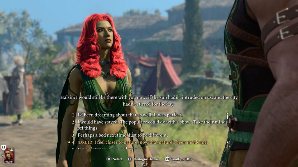 It isn’t surprising that I romance Halsin in every playthrough where I have a poly partner, but the goal of this one was to find out if there was any difference in a monogamous relationship with him, and if the character was also a druid.