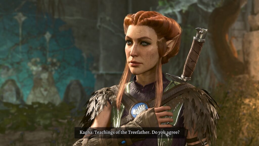 My initial plan was to agree with her and push her toward isolationism. I wanted to see what would happen, particularly since my goal was to romance Halsin, who is indisposed at the beginning of the game (thus opening the door for Kagha’s coup) What would happen when he got back to the grove and it was walled off? Could his magic override it? Could he talk Kagha off the cliff through the wall? Would he hold off entirely on joining my party out of guilt?