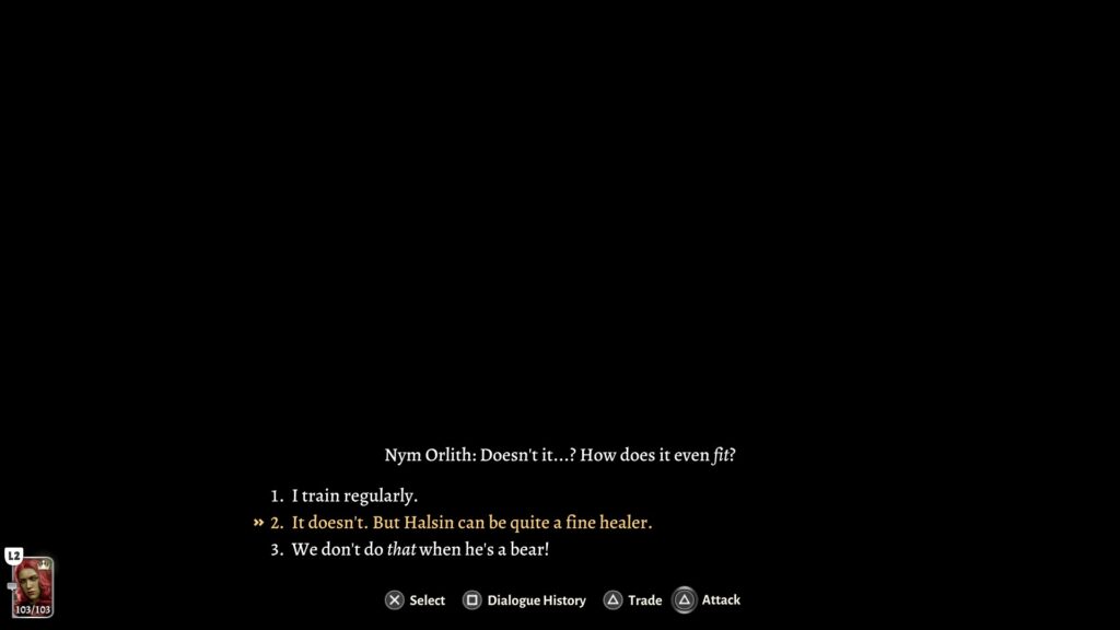 I turned down every character that tried to get with my Honeylocust (and who can blame them, she’s gorgeous) but I miscalculated one thing: Gale is so starved for connection that his standards are low. I think I chose the dialogue about petting his cat (not a euphemism) and it turned into an automatic semi-flirting scene that I did not intend. From then on, everyone started acting like we were in a relationship.