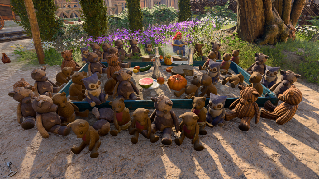 I also continued my search for the stuffed animal collection in BG3, and found more than I ever had before. The final count was 31 stuffed bears, 6 “unfinished” stuffed bears, 3 “surprise” teddy bears, and 6 stuffed owlbear toys. If we count them all, then grand total of 46. As a reward, I decided to have a picnic in the park with all my new friends.