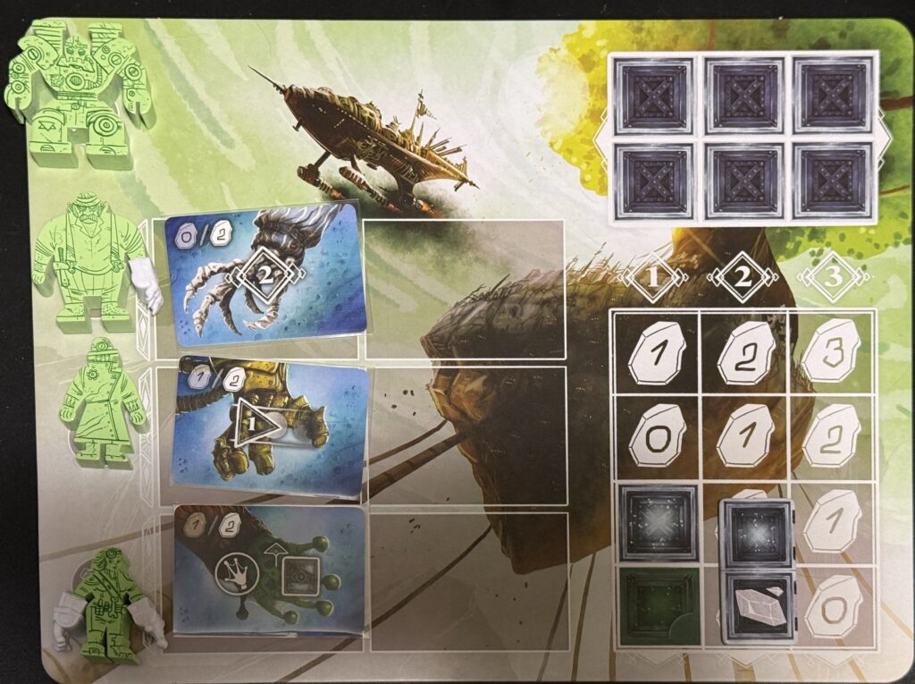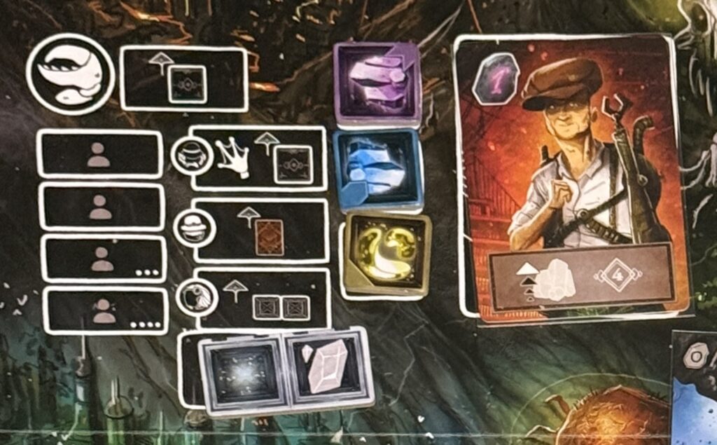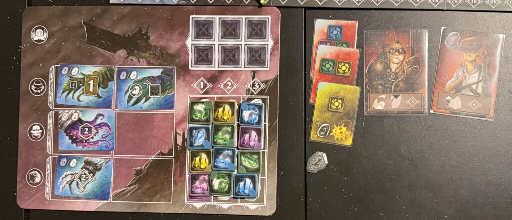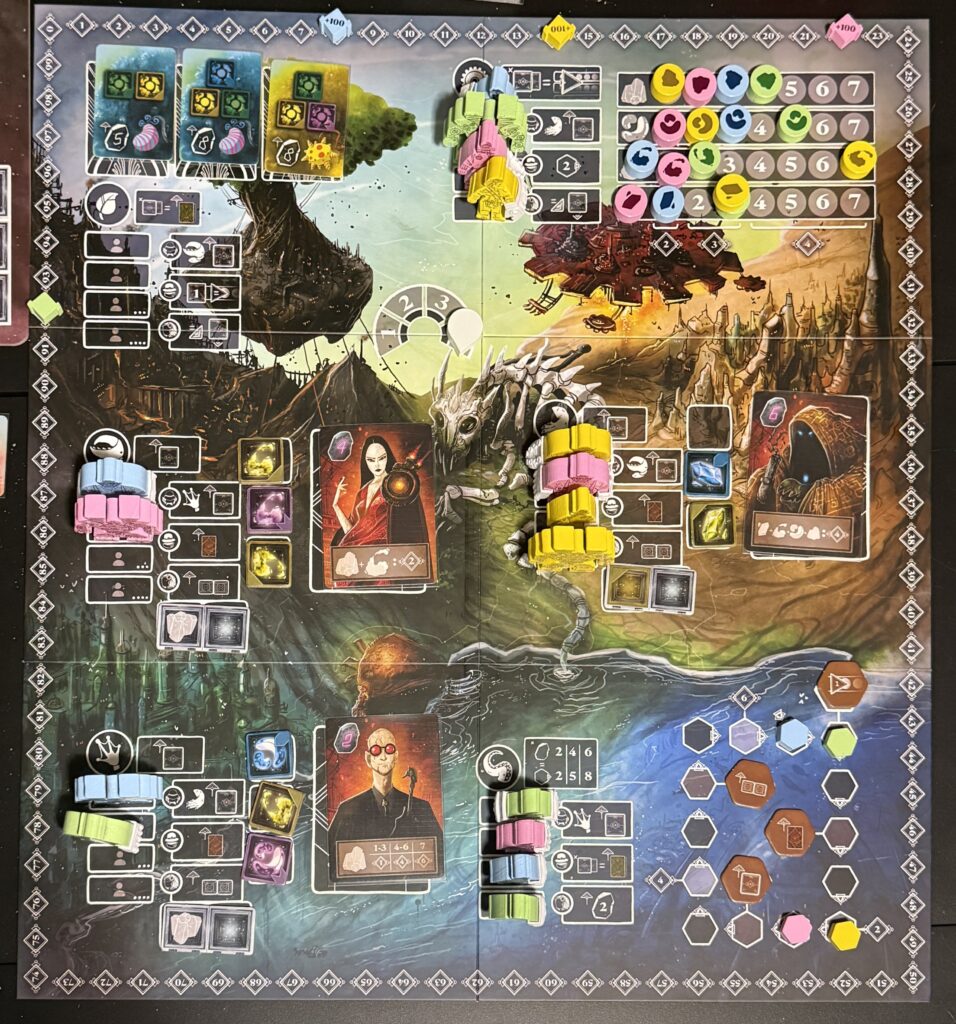 When I first heard the name of the game we were to play, I couldn’t help but think of Witcher 3. However, this game has nothing to do with that.The theme of the game is… well, as J put it, we’re playing the game for its mechanics, not for its tortured backstory. This pictures shows the central board state at roughly half-way through the game. Mutagen is a worker-placement game. You send your worker to the various areas on the board to gain elements, which can be further used to gain victory points.My player board at the same point in the game. Each player has four workers. During the course of the game, each player will get arms they attach to their workers. For example, my second worker from the top has a claw I attached to his figurine. This claw adds two victory points every time I place him.An example of a worker-placement area. The players put their figurines in the rectanges on the left. That lets them claim the benefit of the space; in this case, it’s to claim one of the elements (the square colored tiles in the middle of the photo). The player could also perform a class action related to the area; for example, if I placed that burly figure from the above picture, I could claim an additional element from the worker area labeled by a frog-like hand. The card on the right is a potential member of a player’s crew; they give end-game victory points based on certain conditions.The board state at the end of the game. You can see how we’ve placed our workers in the different areas. I’m playing green; as you can see, I came in last with 92 points. The winner was pink with 122 points. Who played pink?Behold the play area of the winner, J. The primary source of his victory points was filling up his cargo hold with elements as early in the game as possible. Those points are scored at the end of every round. It was a gift that kept on giving… victory points.