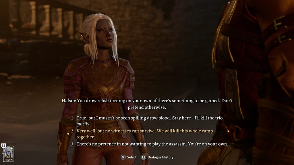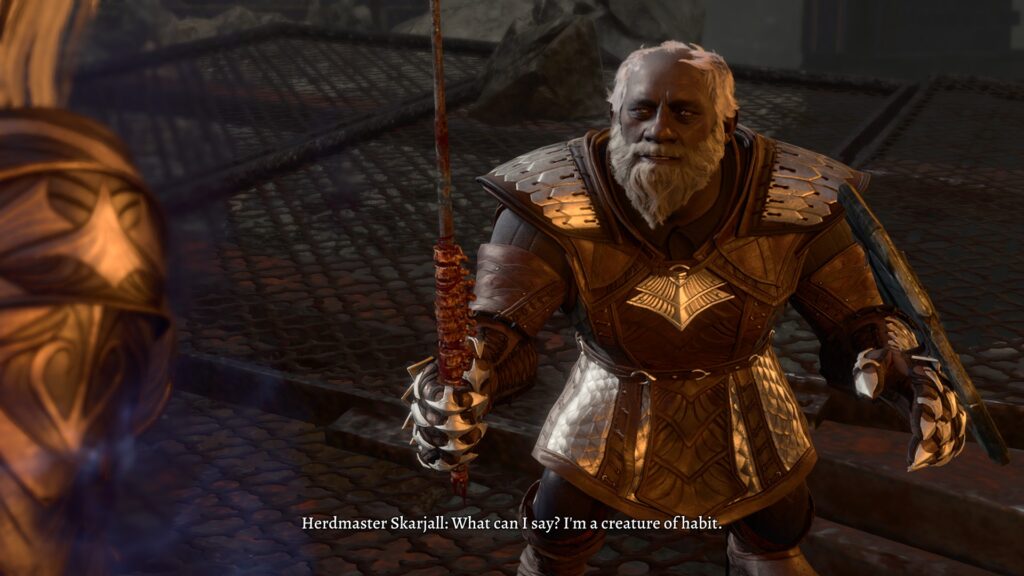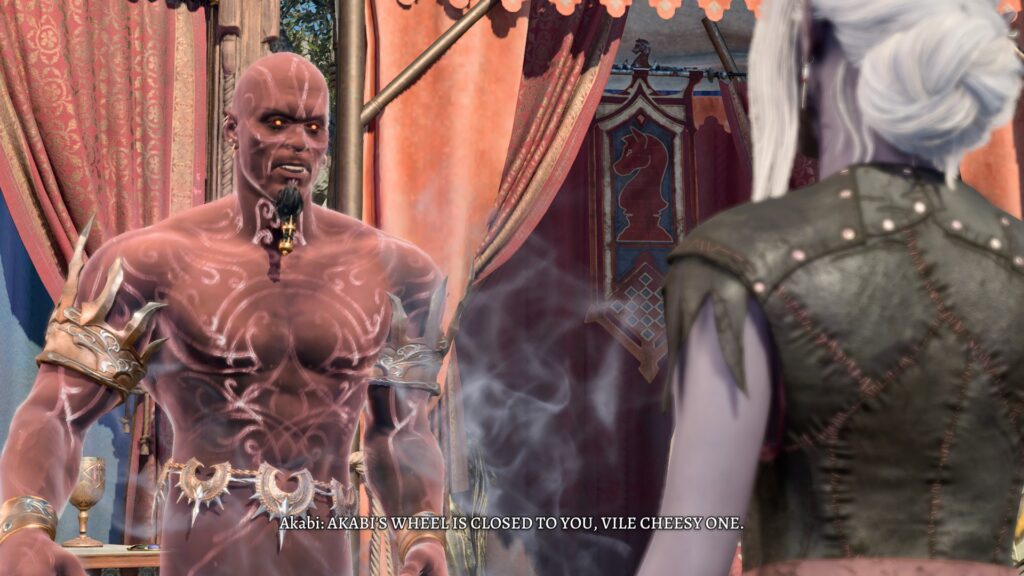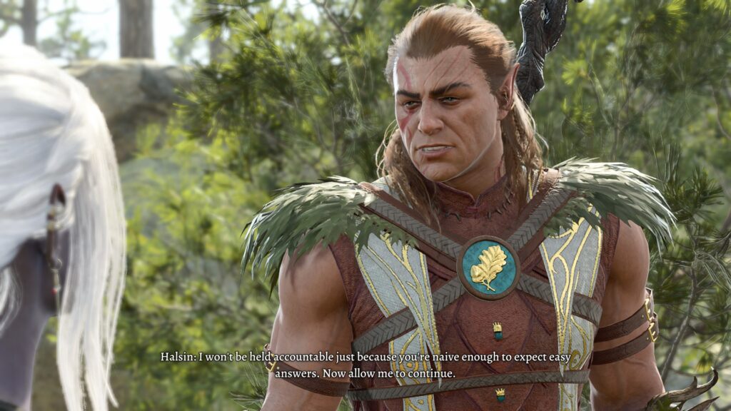 As the game went on, it became clear that it was very clearly not designed to do what I was doing. There were many fallback points to make sure that the main plot would still happen, but some parts of the game just…broke. There were lines of dialogue talking about characters that were not there. Sometimes dialogue would stuck or loop back onto itself indefinitely. Halsin (whom you cannot completely reject from your camp, as he is integral to the story in Act 2) had camp events and dialogue trees that didn’t make sense for where we were at, but I suspect that the game wasn’t expecting someone to lone wolf everything but still be interacting with NPCS.