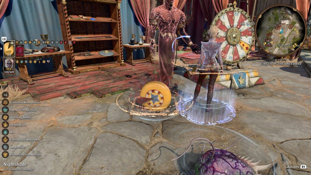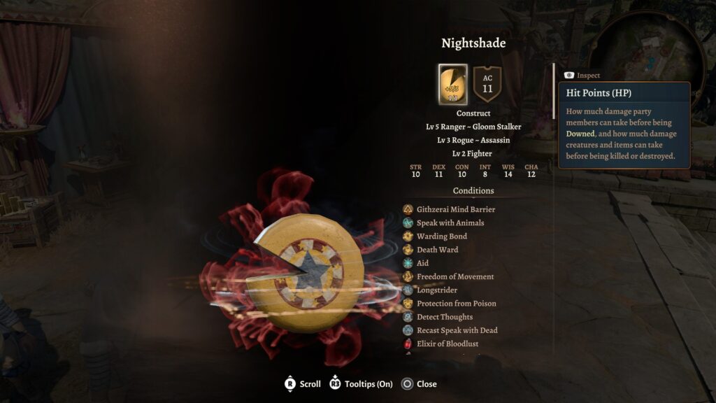 However, there were also a couple of difficulties I did not fully anticipate. We’ve talked at length about DC checks, and normally, your character can have up to 4 Inspiration Points, to be used to re-roll a failed check. You accumulate Inspiration Points by choices or events that happen in the story, based on the “background” of the characters around. For instance, characters with an Urchin background get an inspiration point after succeeding an epically deceptive lie, characters with a Noble background get an inspiration point after the first purchase at a bougie boutique, etc. A party that has a wide array of backgrounds can accumulate inspiration points in various settings, or if you know there is a situation coming up that will give Outlander inspiration points, then you could make sure to have Karlach and Halsin in the party, to get inspiration points from both. However, in solo/duo mode, I didn’t accumulate inspiration points very often, and only in certain situations, which meant I had to be VERY careful about spending them.