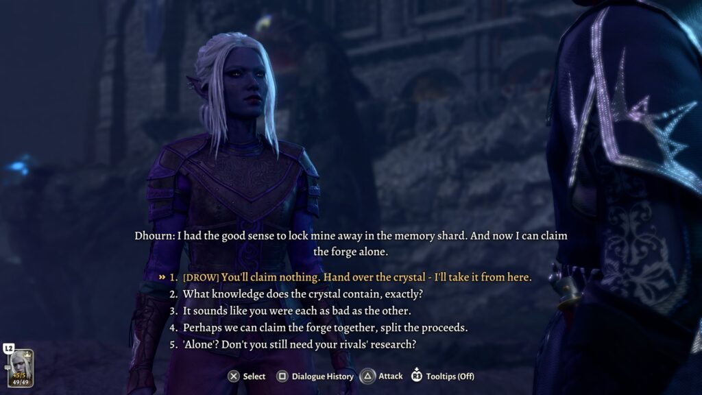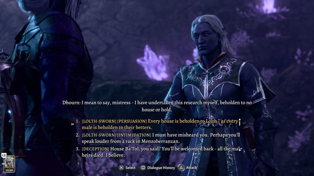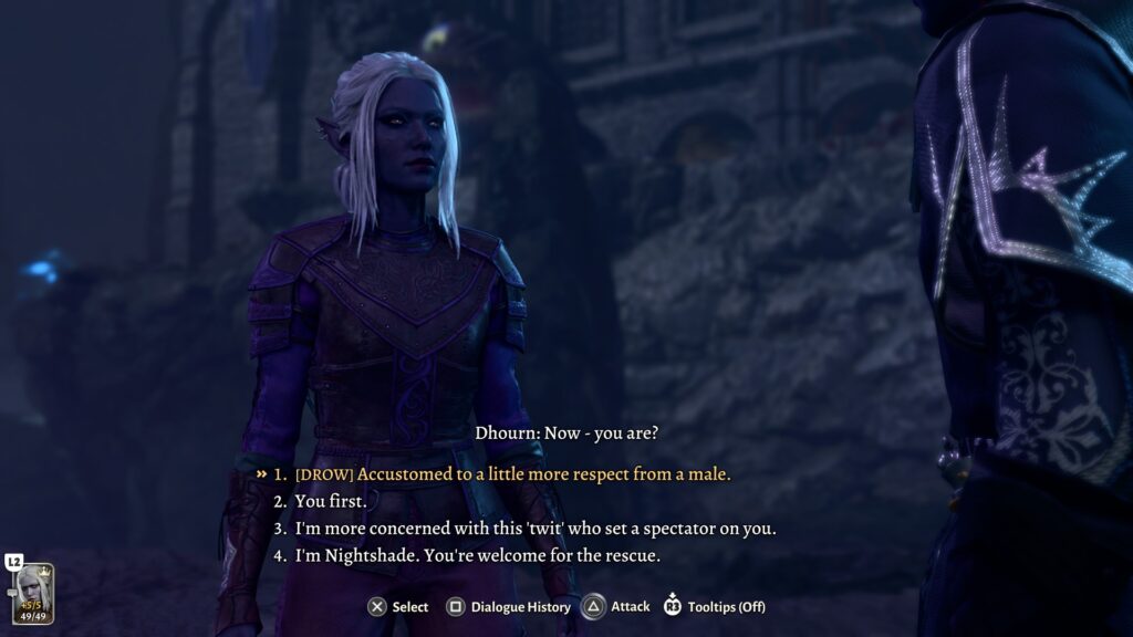 As we already can already assume from the above, drow societies are matriarchal, and men are treated as second-class citizens. Part of what made me decide on a female drow character is that we come across one particular character in the Underdark: Dhourn, a male drow, a third son, and very much a pretentious dick to any previous characters. I wondered if he would change his tone if he was being confronted by a female drow, and I was not disappointed with the dialogue options.