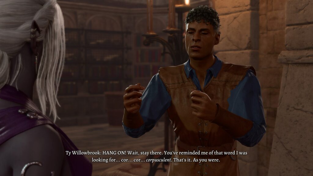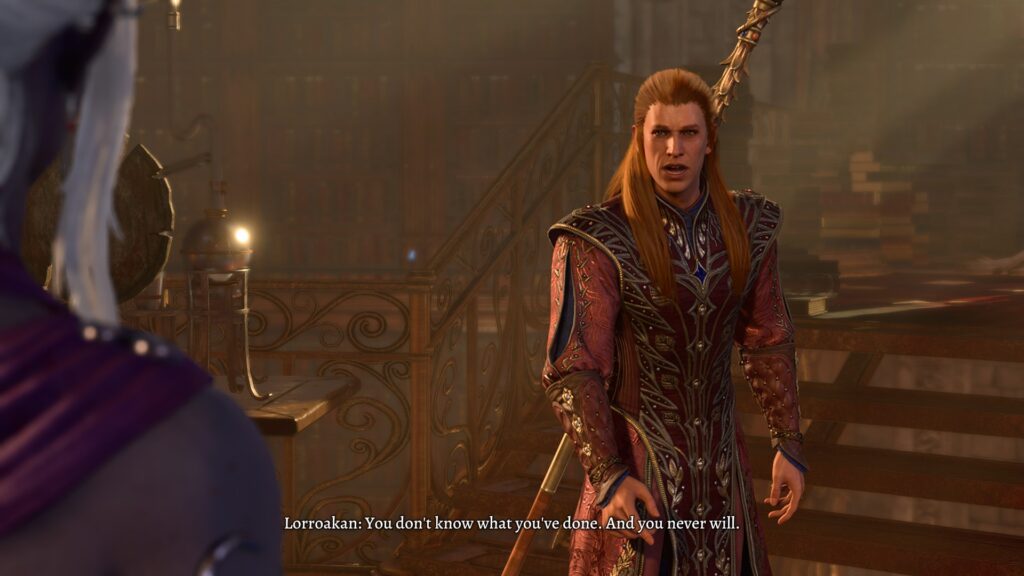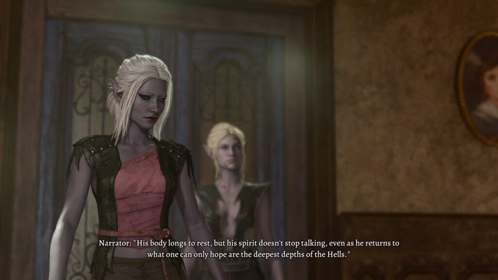 The companions faded away after Act 1 or early Act 2, but it did make me curious as to what would happen to their individual plotlines. Karlach was wounded and had the forces of Hell after her, so she probably got captured/went down fighting. Lae’zel and Shadowheart we saw or can assume. Gale and Wyll I never saw again after I left the areas that they first show up in. What about Astarion? His personal story is that he is running from his master, whom he is now trying to turn on. Well, when I got to the palace in the Lower City and confronted his master (because why not, it’s a fun fight), I came across this: