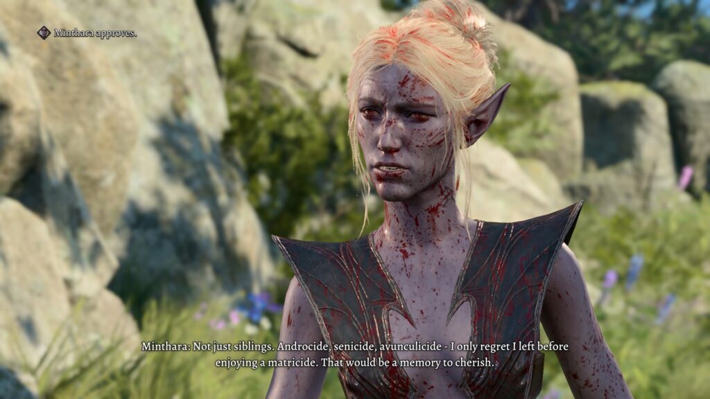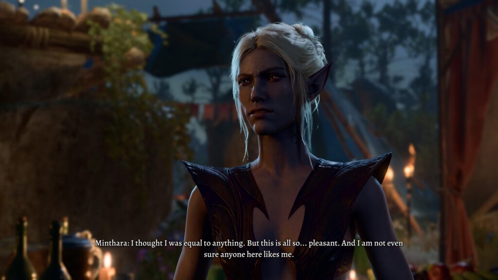 In her own way, Minthara is probably the most supportive of the companions. She certainly has her preferences and alignment, and on her own would probably be an ‘evil’ character, but she is very much a ride or die companion. If she’s with you, she has your back, no matter what.