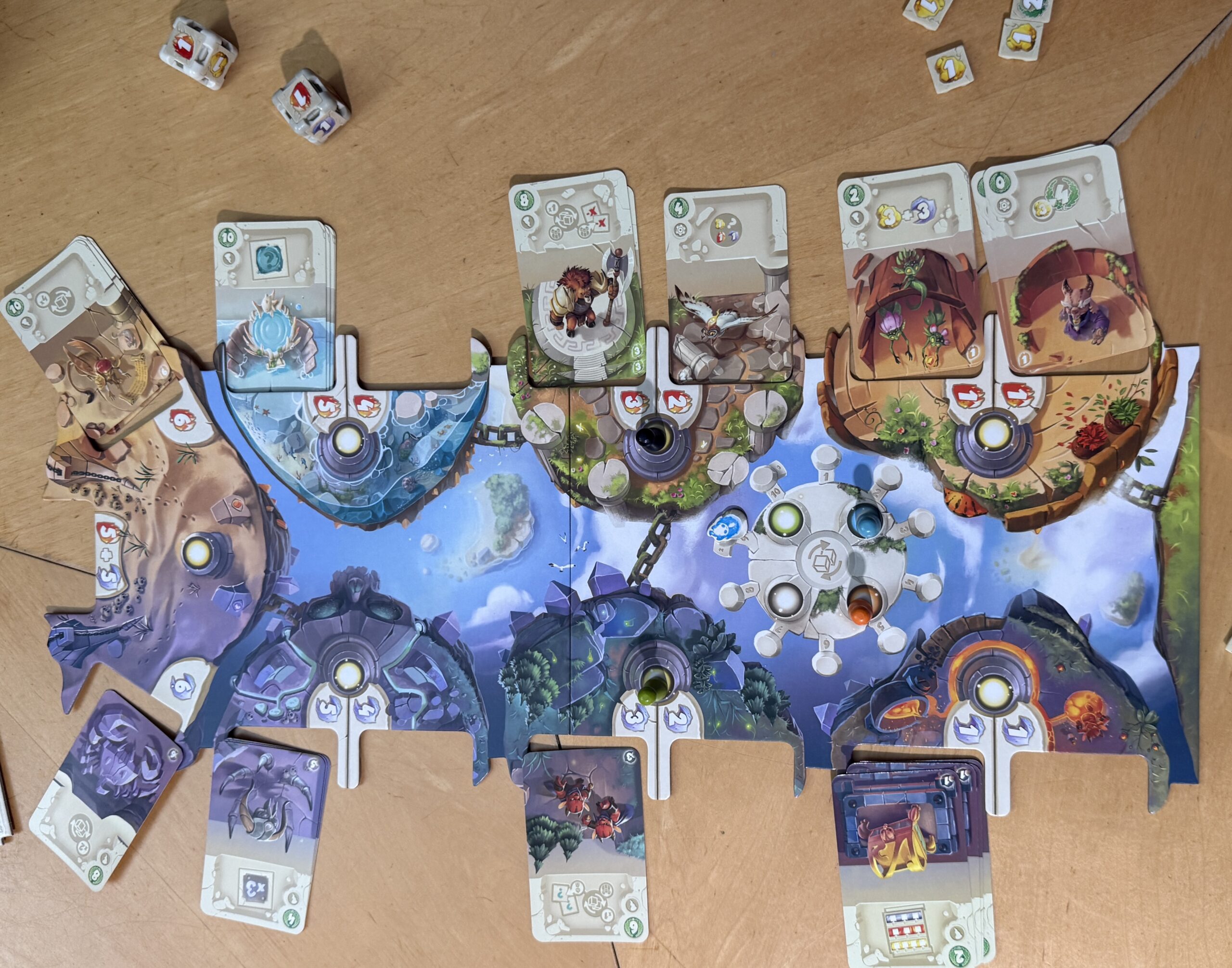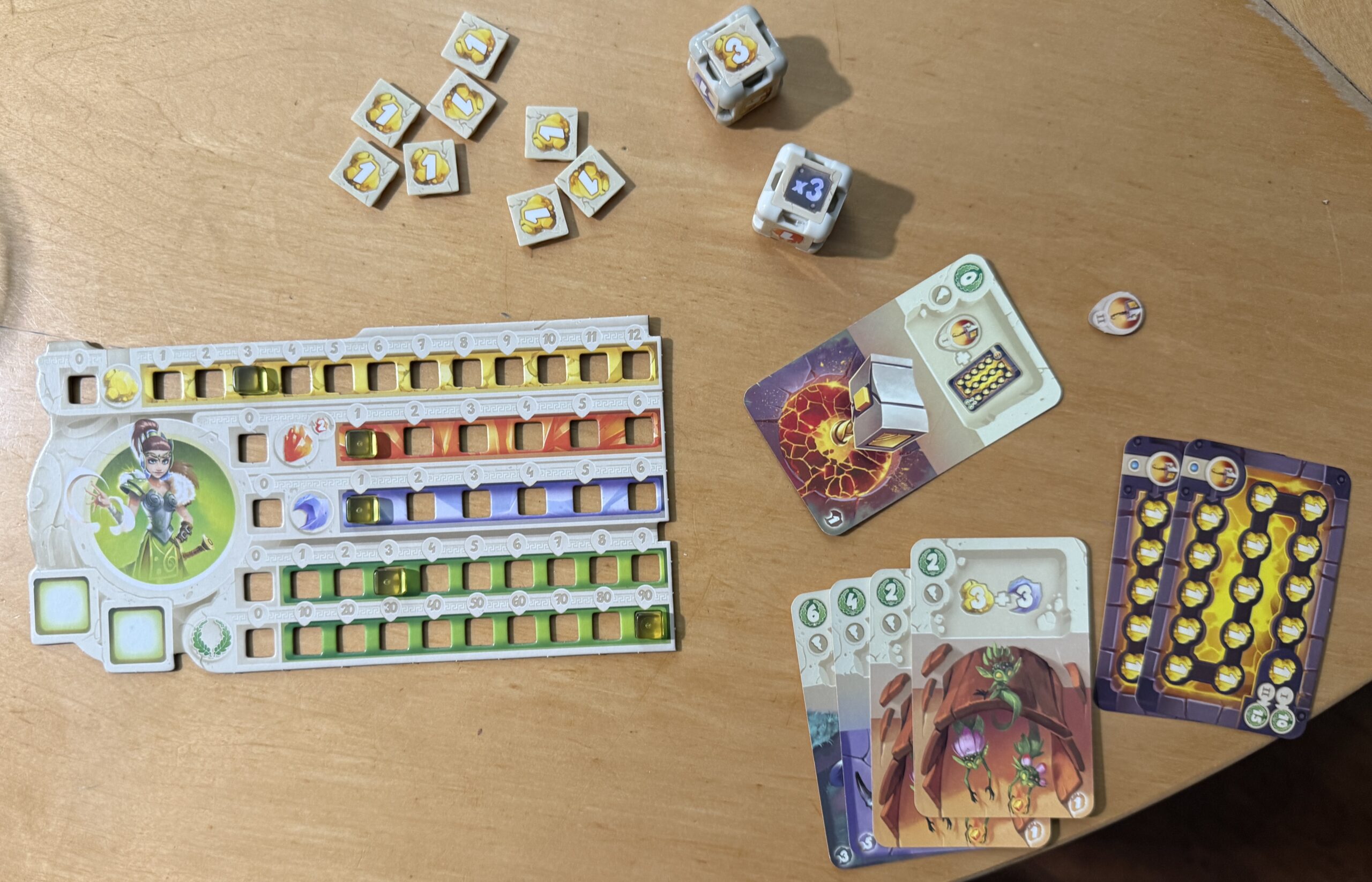 This is the pool of dice faces that players can purchase with gold. I pursued a “gold strategy,” purchasing and replacing the faces of my dice so I might accumulate more gold. The other players chose faces that helped them earn the red and blue currencies.
