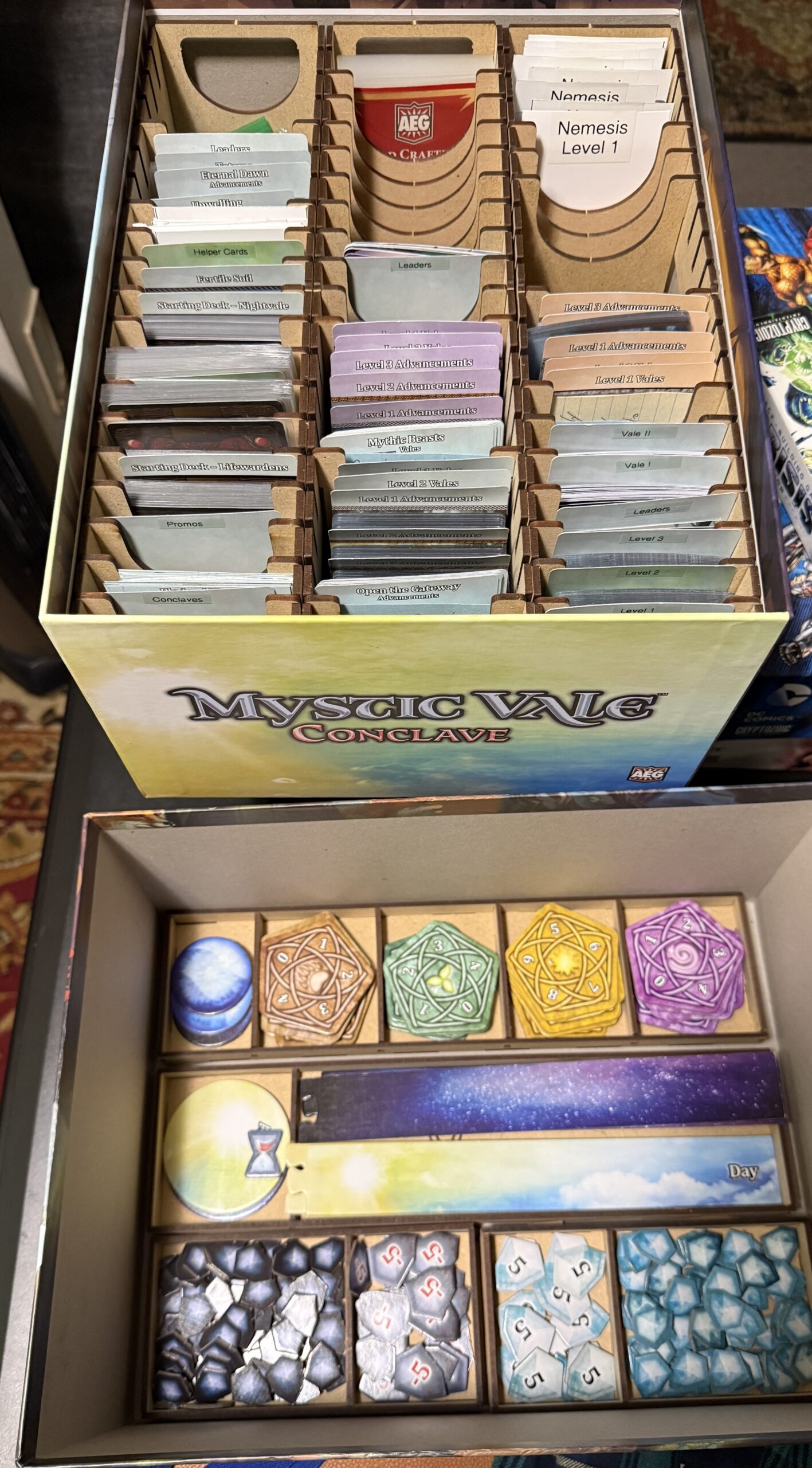 I purchased a game box insert for Mystic Vale Conclave a couple of years ago. I use it to organize every Mystic Vale expansion I own. I think I have most (if not all) of them.
