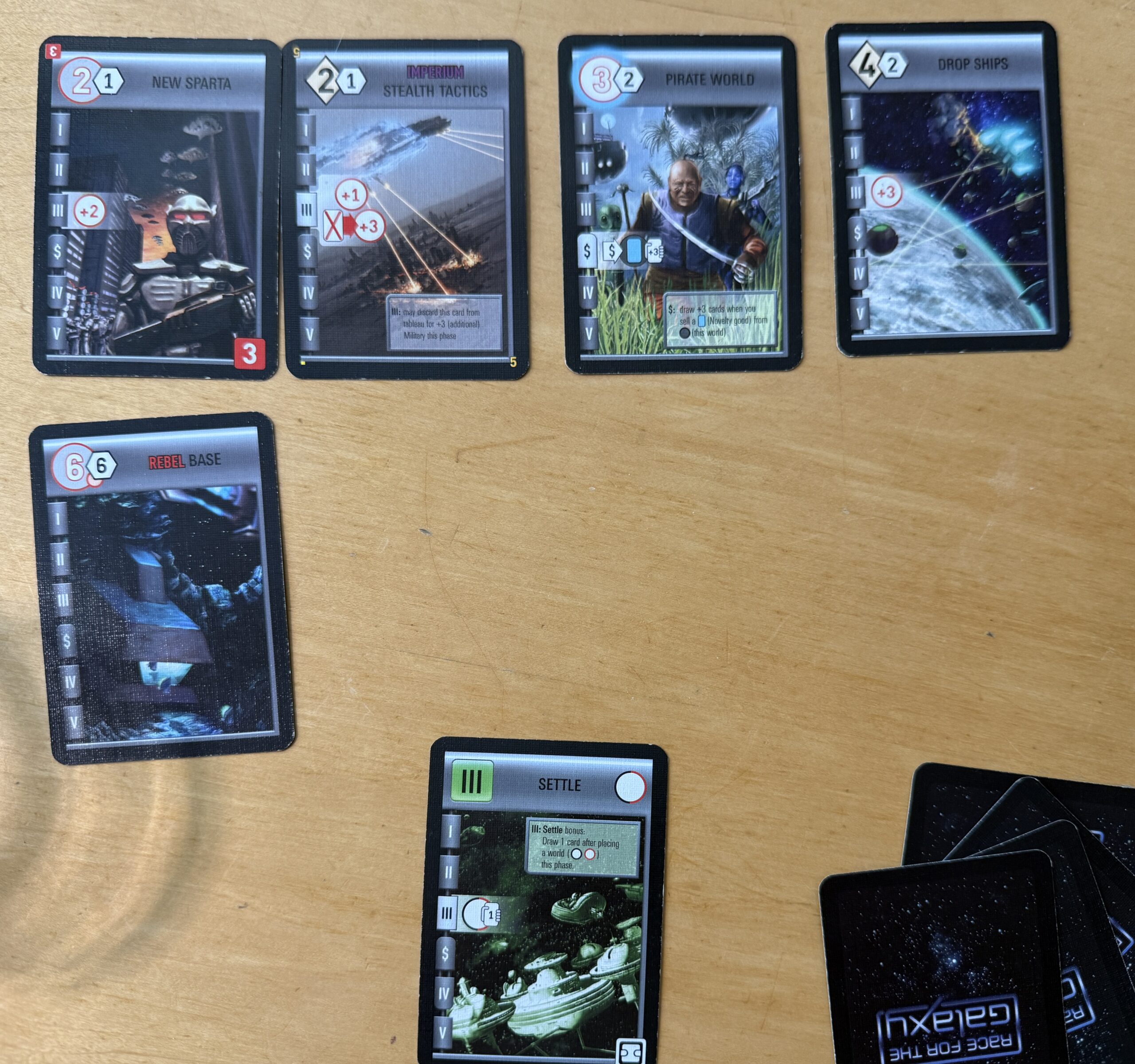 In Race for the Galaxy, players build a tableau of settlements (circle in the upper left of the card) and developments (diamond in the upper left). The action economy is controlled by cards each player chooses every round. In the bottom of the picture you can see that I chose a Settle action for the round. That means that every player has a chance to put down a settlement card (if they can pay for it). As one who put down the Settle card, I get an extra benefit (an additional card for my hand).