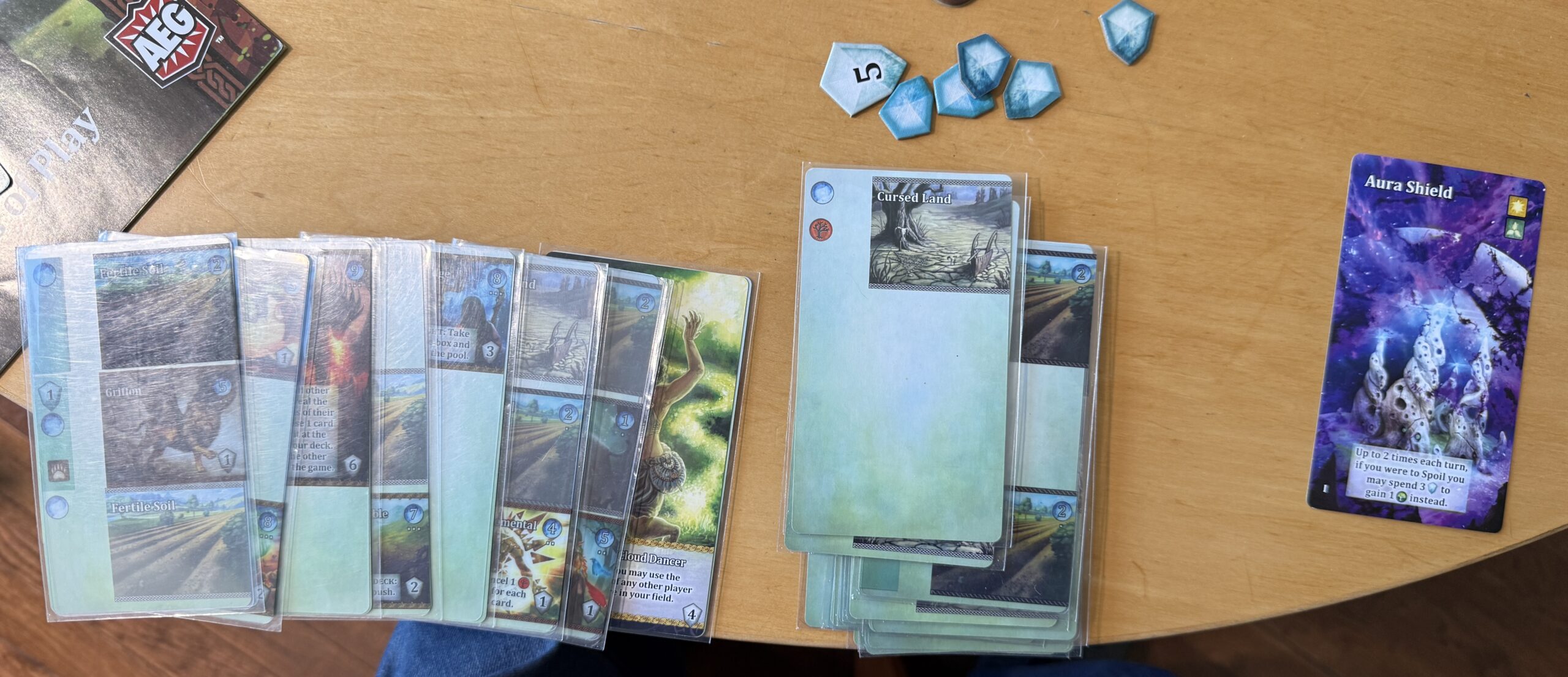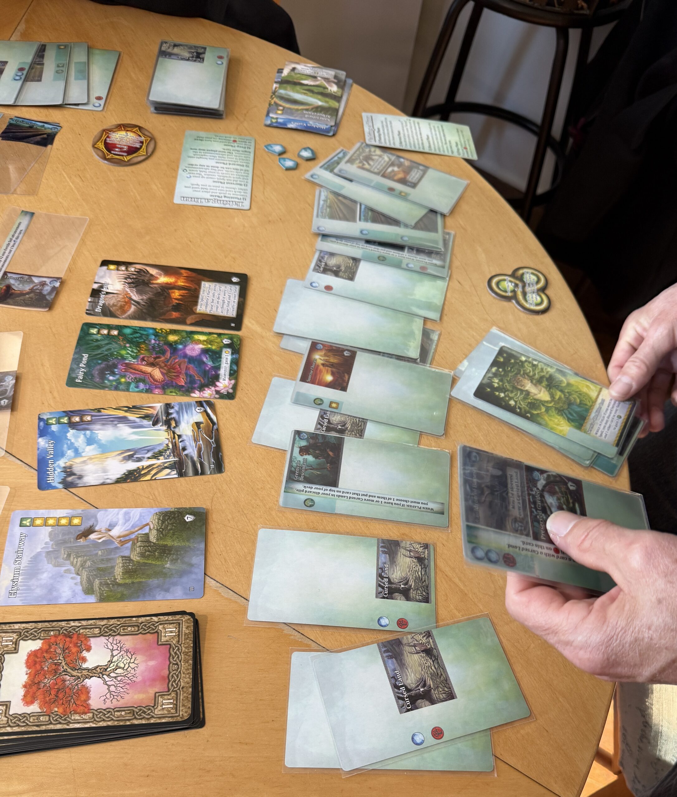A general strategy to pursue is to find combinations of cards that cancel out the effect of those red-tree icons. Here we see that Michael has set things up so that he could play all 20 cards in his deck at once. On the left you can see Vale cards that a player can purchase if they have the matching icons on the card inserts they’ve purchased.