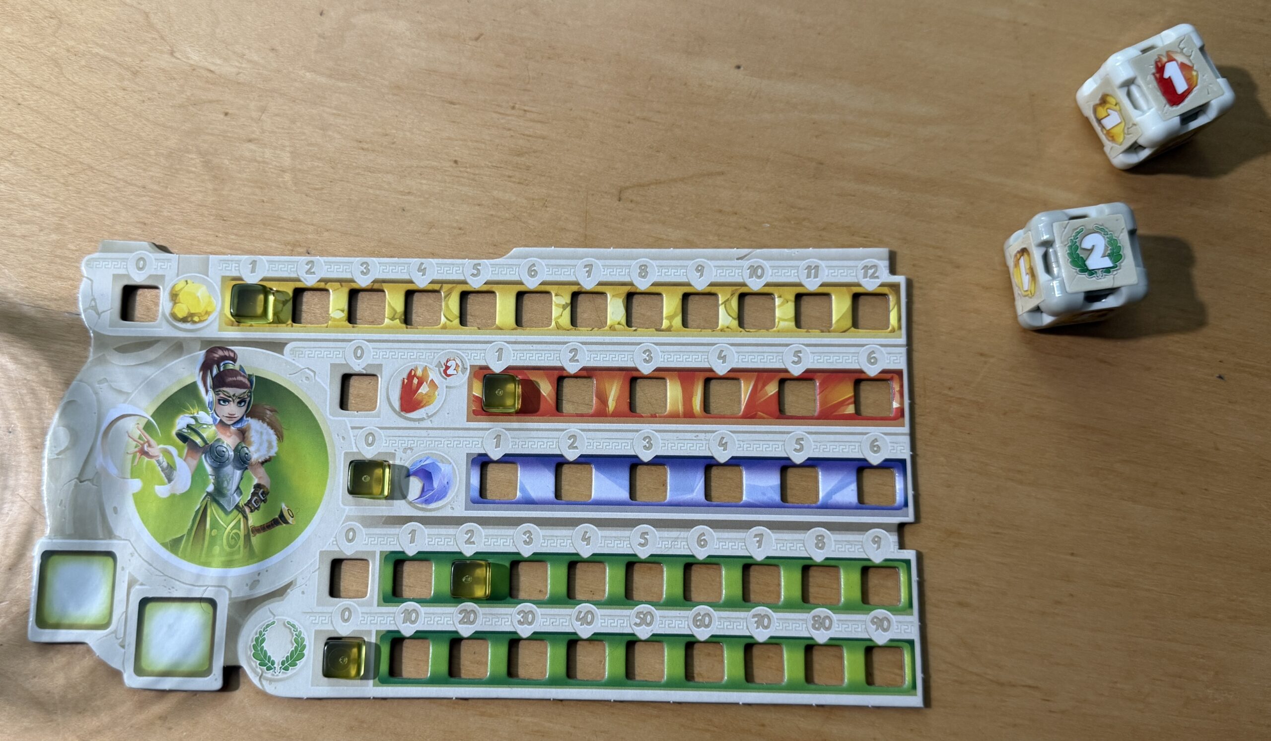 As Mystic Vale is a card-crafting game, Dice Forge is a dice-crafting game. The dice have detachable faces. As you roll the dice, you accumulate resources on your player board. Here you see that I rolled one “red” icon and two points of “green” (victory points), and I’ve indicated that on my player board. The one point of gold was from being the third player to go in the game’s first round.