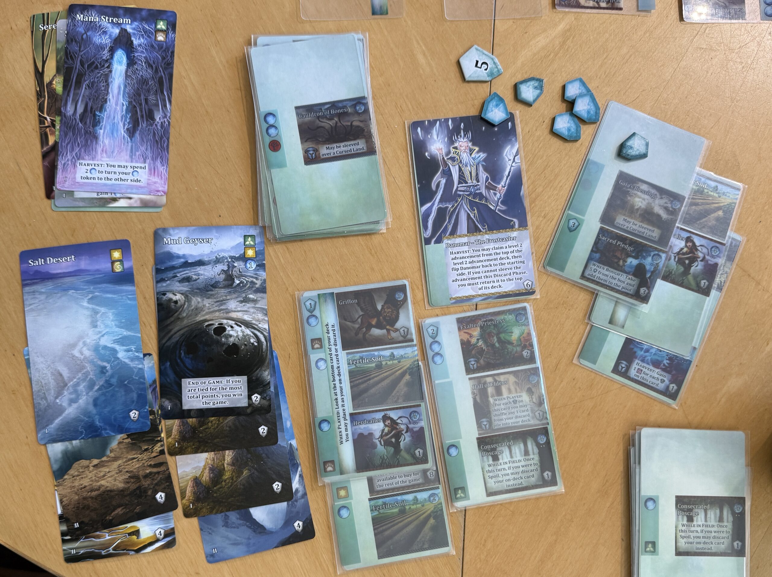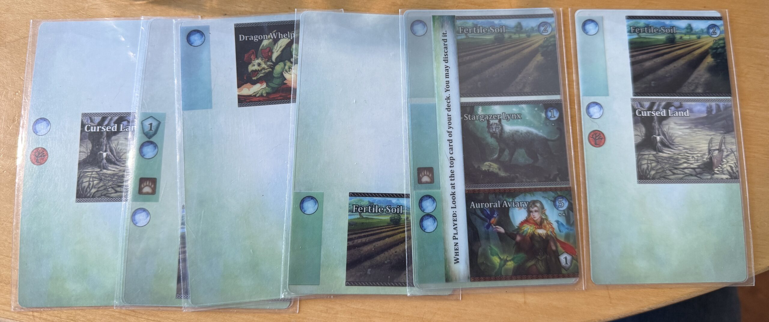 Here’s an example; it’s one of the sets of cards I played during the game. If you see a darker shade of blue/gray on the left-hand side of the top/middle/bottom of card, it’s from a transparent insert I purchased with mana (the blue circles you see on the cards). The second card from the right is entirely filled with inserts I purchased.