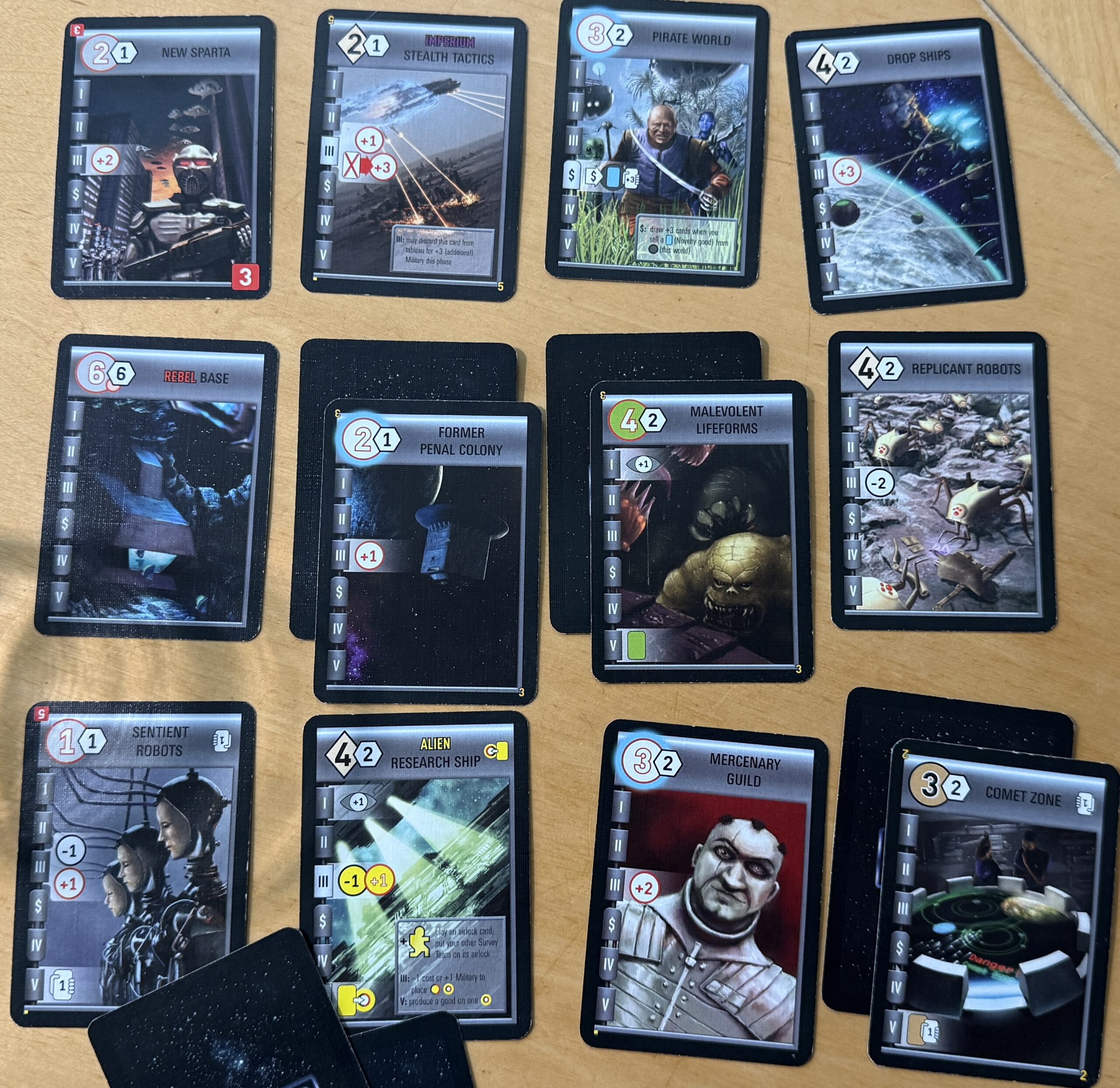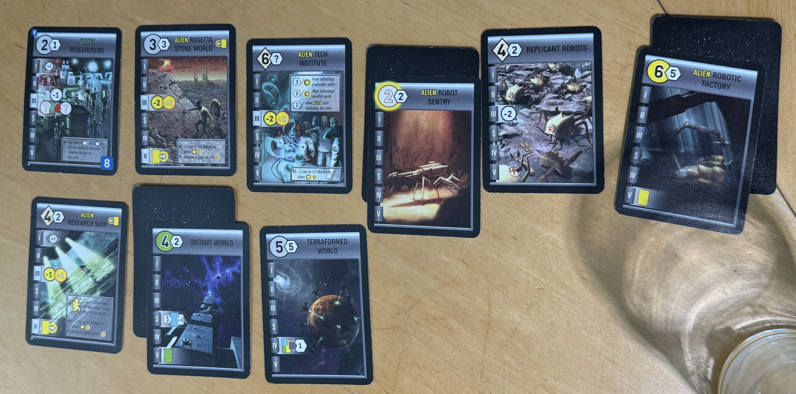 This was my tableau at the end of the game. I triggered end-game by having 12 cards in my “empire.” I chose a military strategy; that is, I focused on acquiring settlements with a red-outlined circle in the upper left of the card.