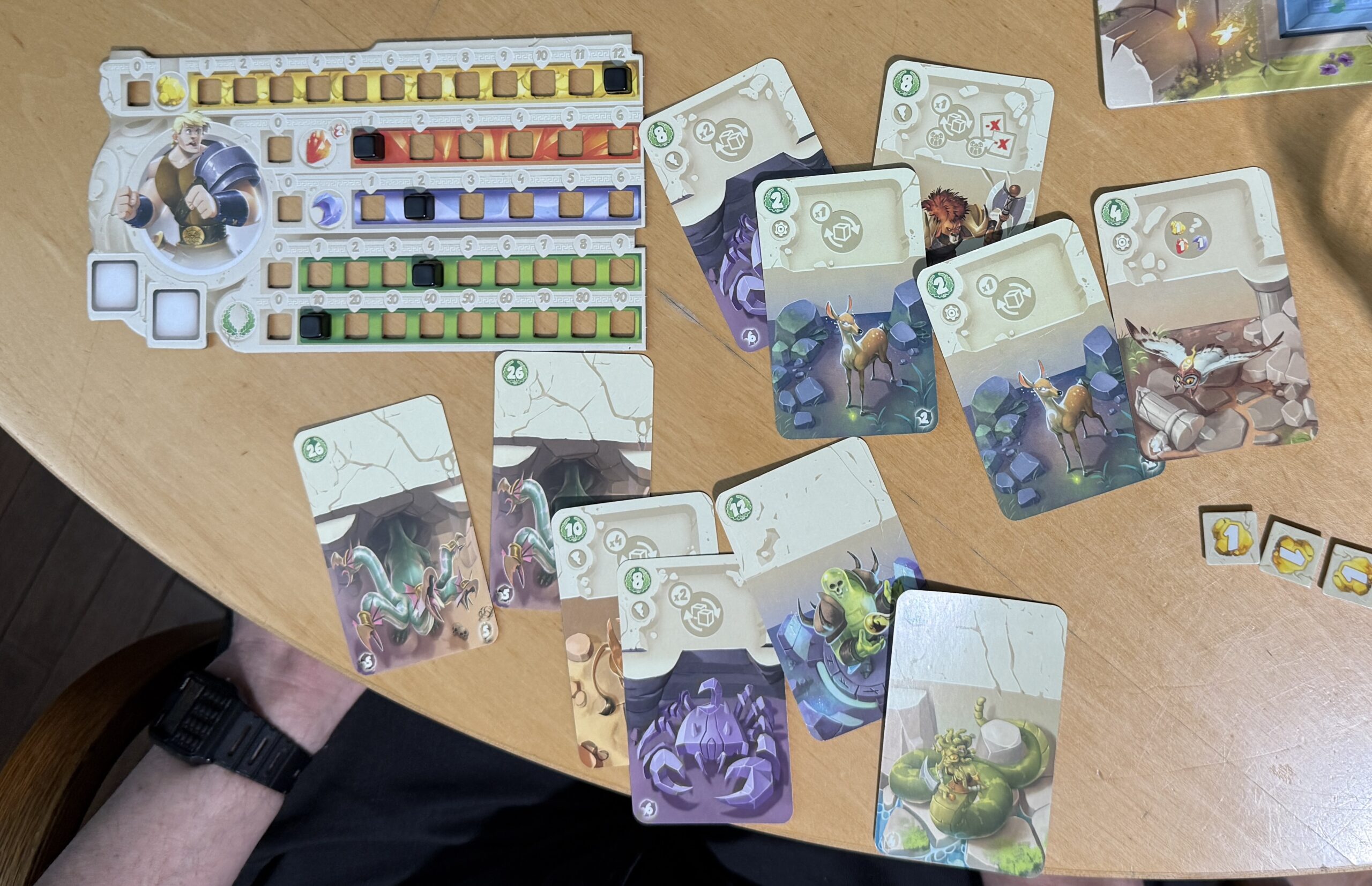 Behold the player area of the winner, Mike. I see 120 points in the picture, but my memory suggests that he’d earned more than 130.