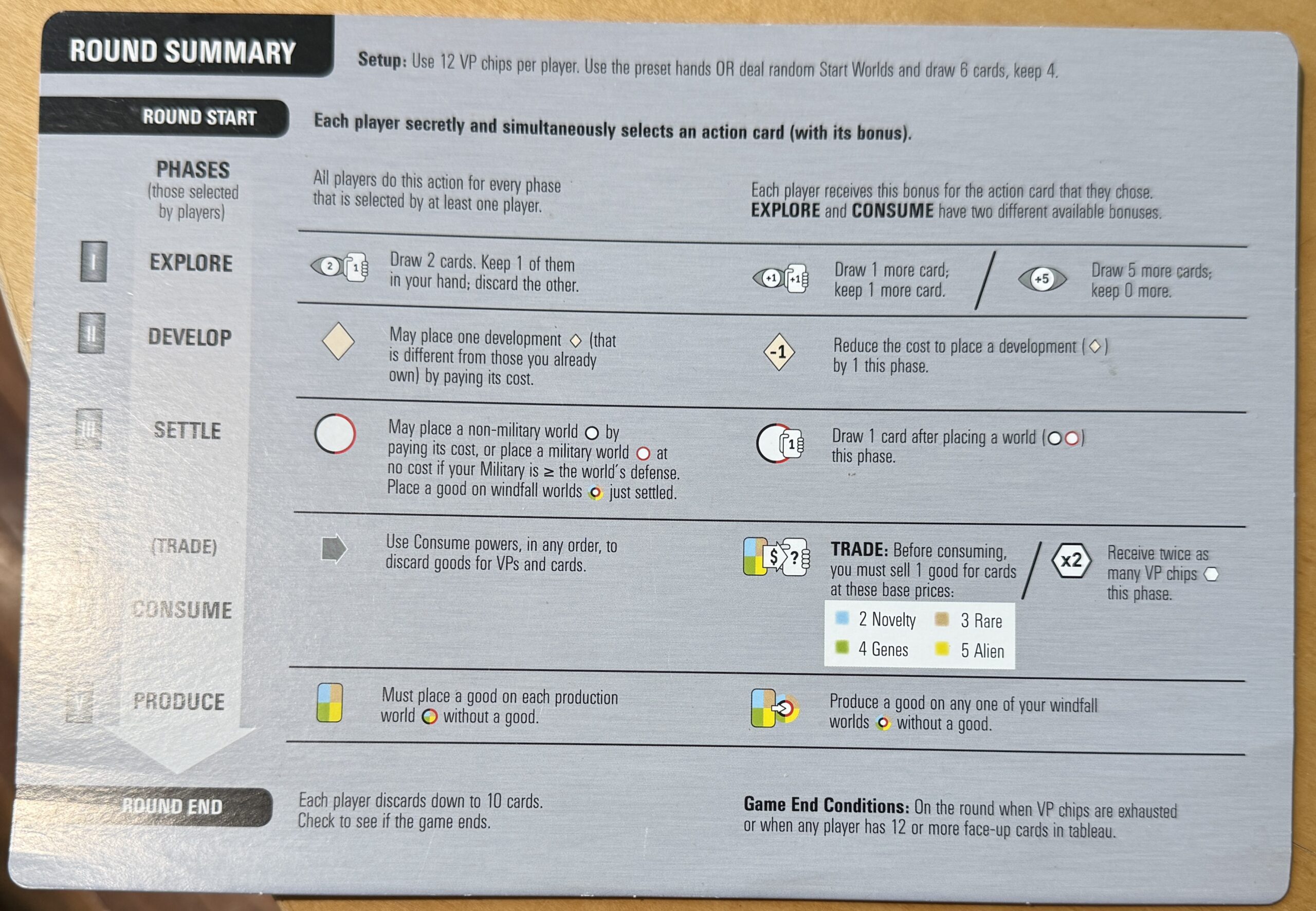 As with Roll for the Galaxy, my chief complaint about Race for the Galaxy is the confusing use of icons. But after a while the game-play makes sense. It’s simpler than what you might guess from reading this helper card.